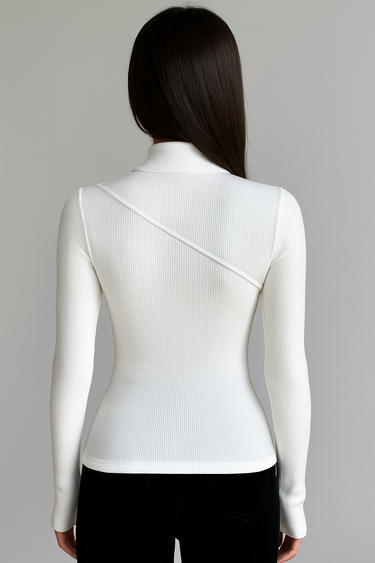 Designed for comfort with a playful twist. This fitted ribbed top features a mock neckline and subtle diagonal seam detailing for a clean and sculpted silhouette—perfect for layering or wearing on its own.