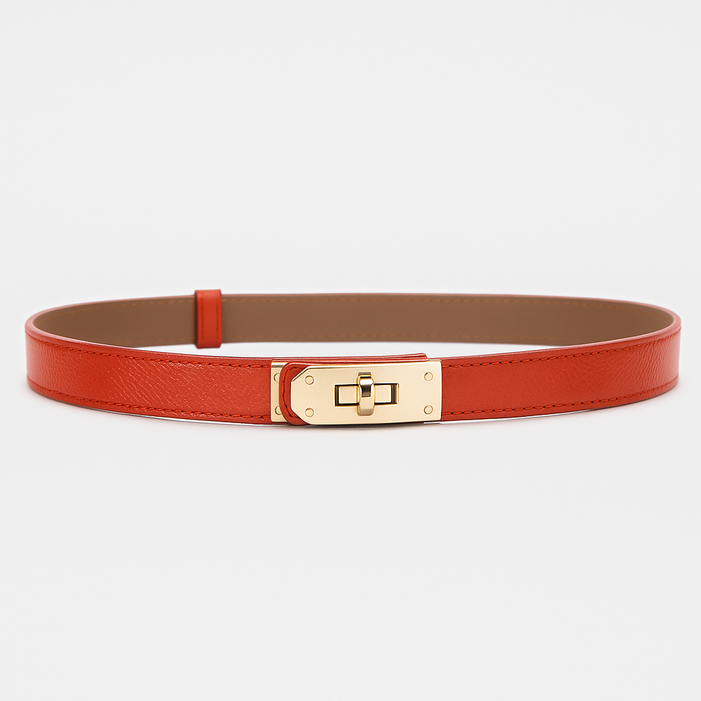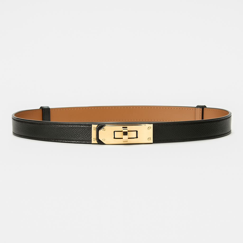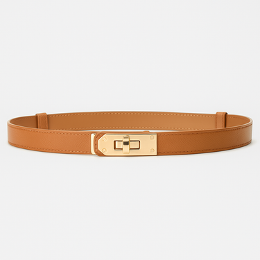 Minimal lines meet polished detail. This waist belt balances clean structure with a distinctive twist-lock clasp in gold-tone metal. Designed to cinch softly at the waist, it adds instant definition and understated elegance—whether styled over a dress or layered with tailoring.