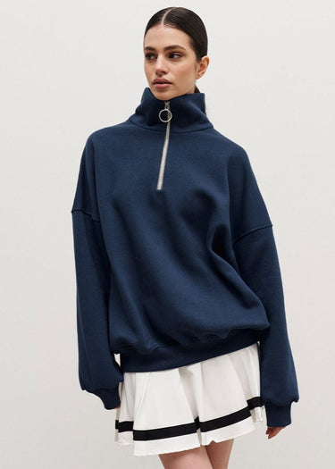 Effortlessly casual with a sporty twist. This oversized sweater features a half-zip neckline with a statement ring pull, dropped shoulders, and a softly structured silhouette—perfect for crisp mornings or post-workout lounging