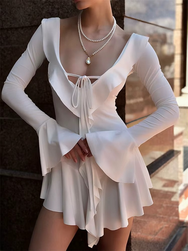 A romantic take on the classic mini. This ruffled dress features a lace-up neckline and flared cuffs, creating a soft silhouette with a confident edge.