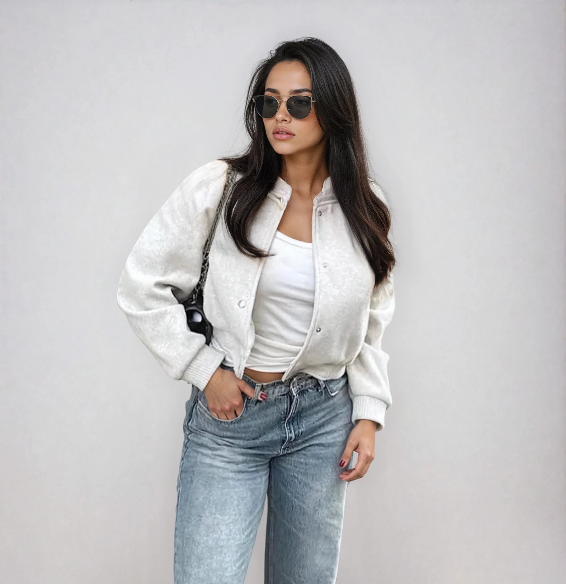 Designed for comfort with a playful twist. This varsity-inspired wool-blend jacket redefines casual layering with its clean lines and soft structure. Featuring a round neckline, snap-button closure and practical side pockets, it’s a versatile essential that works across seasons. Available in beige, light grey, camel, mid-grey, and black.