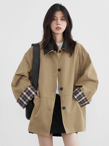 Designed for casual sophistication. This brown button-up jacket features a clean silhouette accented with contrasting plaid details at the collar and cuffs. Large flap pockets add both style and function, while the structured yet relaxed cut makes it an easy layering piece. A versatile design that blends everyday wear with subtle statement details.