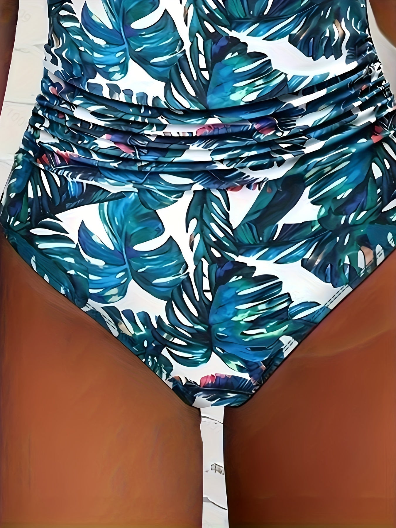 Elevate your swim style with this vibrant halterneck one-piece, designed to shape, support and highlight your natural silhouette. The deep teal top contrasts beautifully with the tropical leaf-printed bottom, creating a striking look that feels both fresh and timeless. With a wrapped bust and gentle ruching at the waist, it flatters effortlessly—perfect for beach days, sunny getaways or poolside lounging with confidence.