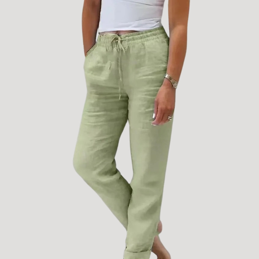 Light, breathable and endlessly versatile – these women’s linen trousers are made for relaxed summer days. Featuring an elasticated drawstring waist and soft tapered leg, they offer comfort without compromising on style. Crafted from a breezy linen blend that’s ideal for warm weather. Easy to dress up or down, they’re your go-to for holidays, casual days or evening strolls. Pair with a tank top or loose blouse for effortless summer style.