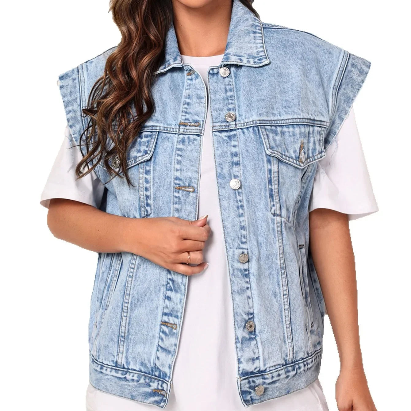 Women’s Casual Oversized Denim Vest with Button-Up Front and Classic Chest Pockets
