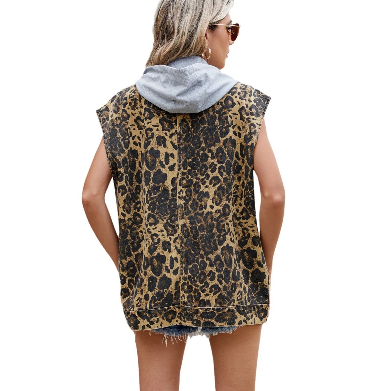Women’s Leopard Print Sleeveless Denim Vest with Button-Down Front and Utility Pockets