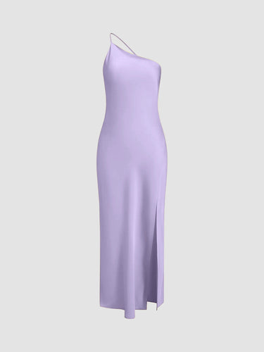 A sophisticated staple for summer evenings and special escapes. This silky maxi dress features a one-shoulder neckline, soft lustrous finish, and fluid drape with an alluring open back—cut to effortlessly skim the figure with a side slit for added movement and charm.